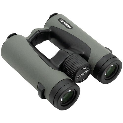 The olive green Optisan LR ED 10×34 Binoculars deliver bright, clear views with 86% light transmission. Featuring an ergonomic open-hinge design and a stable grip, they are perfect for bird watching, observing insects, and other outdoor activities. IPX7-rated for waterproof and fogproof performance, with nitrogen-purged lenses for added durability. Twist-up eye cups, removable ocular and objective lens caps, and close-focusing optics provide convenience and flexibility for all your outdoor adventures.